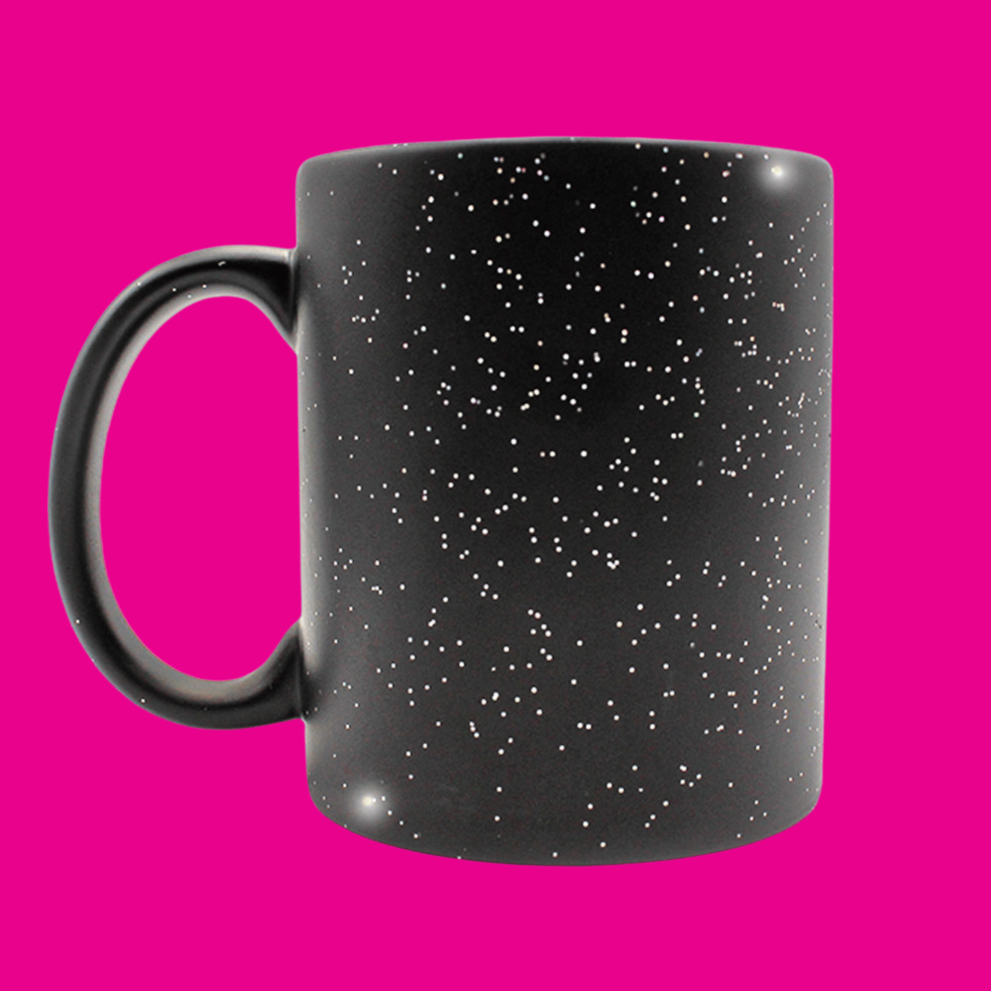 Dale un brillo especial a tus diseños con la Taza Mágica Glitter Negra de 11 Oz. Color Make™. Su efecto térmico permite que, al verter un líquido caliente, la superficie negra con destellos brillantes desaparezca para revelar la imagen sublimada, creando un impacto visual único y sorprendente.